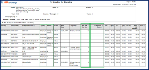 The following enhancements have been applied to the In Service by Quarter Report (Report > Caregiver > In-Service by Quarter):