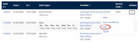 Note: To sync and refresh an authorization that has been edited by the Provider, click the three dots to display a menu and select Sync and Refresh. Sync and Refresh updates the authorization within the HHAX system.