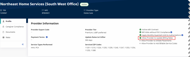 In Provider Setup (Admin, Provider Setup) an existing setting, Allow Provider to Update Billing Rates, can be selected to allow the Provider to edit Service Code rate information (rates, date ranges, and billing units).
